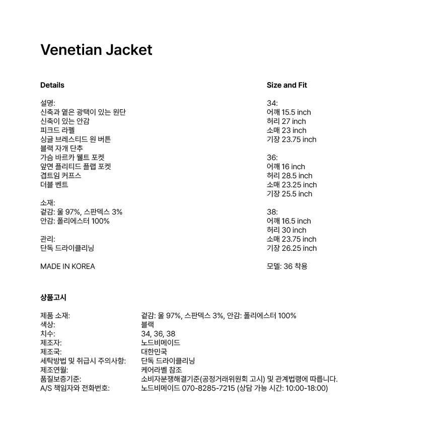 NODEBEMADEVenetian Jacket00EA review$507Shipping InformationCode9768198890Shipping MethodCourierShipping FeeFree ShippingAvg shipping day?3DaysInternational ShippingUnavailableJeju/Remote AreasJeju ₩4,000/Remote Areas ₩4,000WALA WAVE x Lee Yunjung Limited edition art collaborations'Han Seung-soo' Model PICK Fashion GuideTOTAL$NaNCart