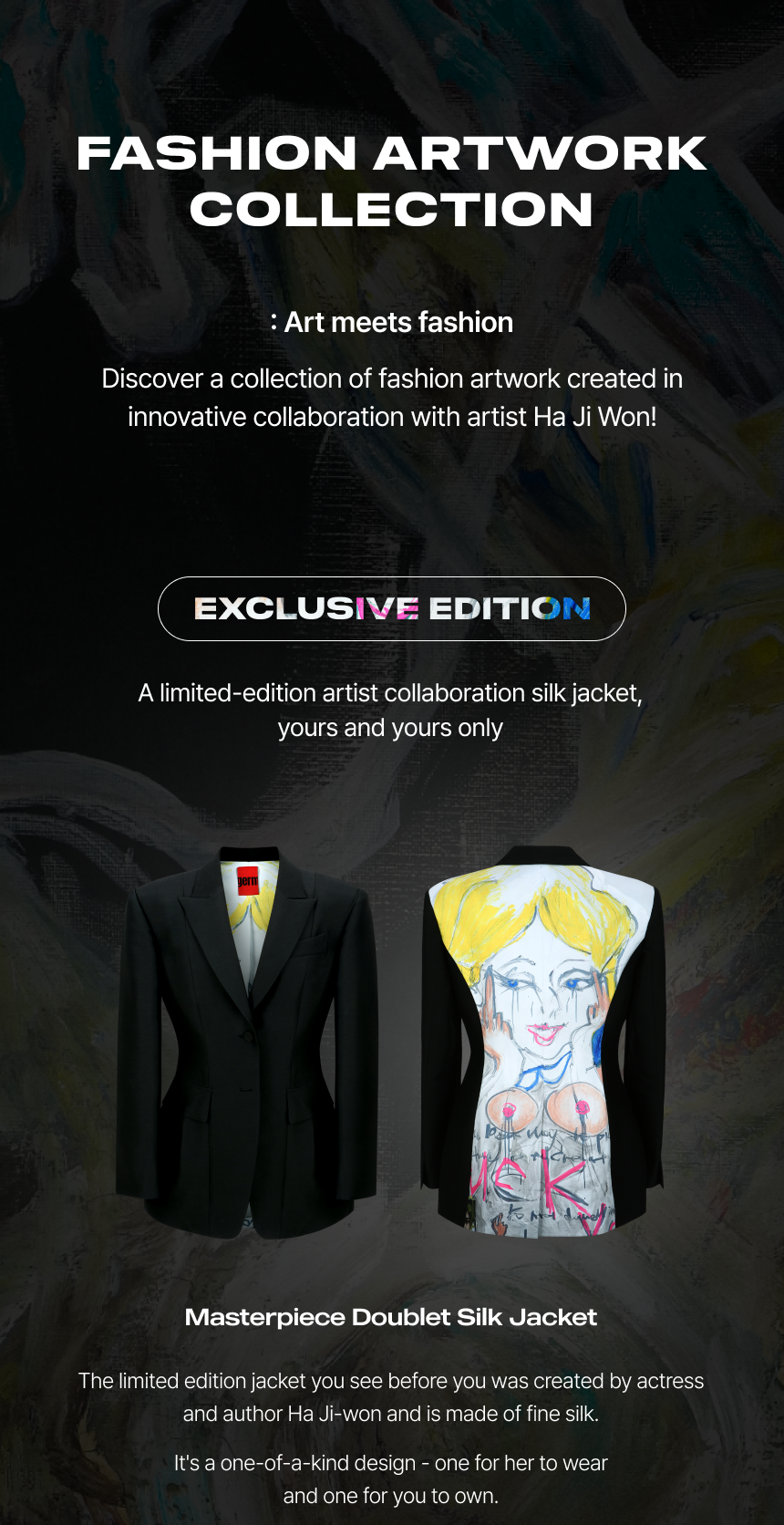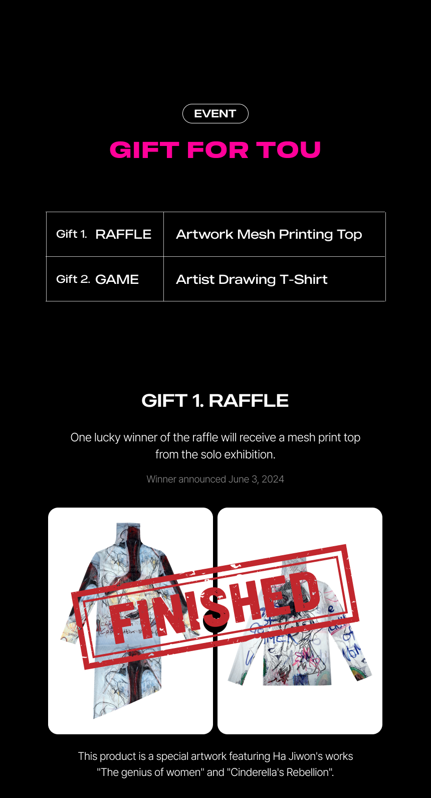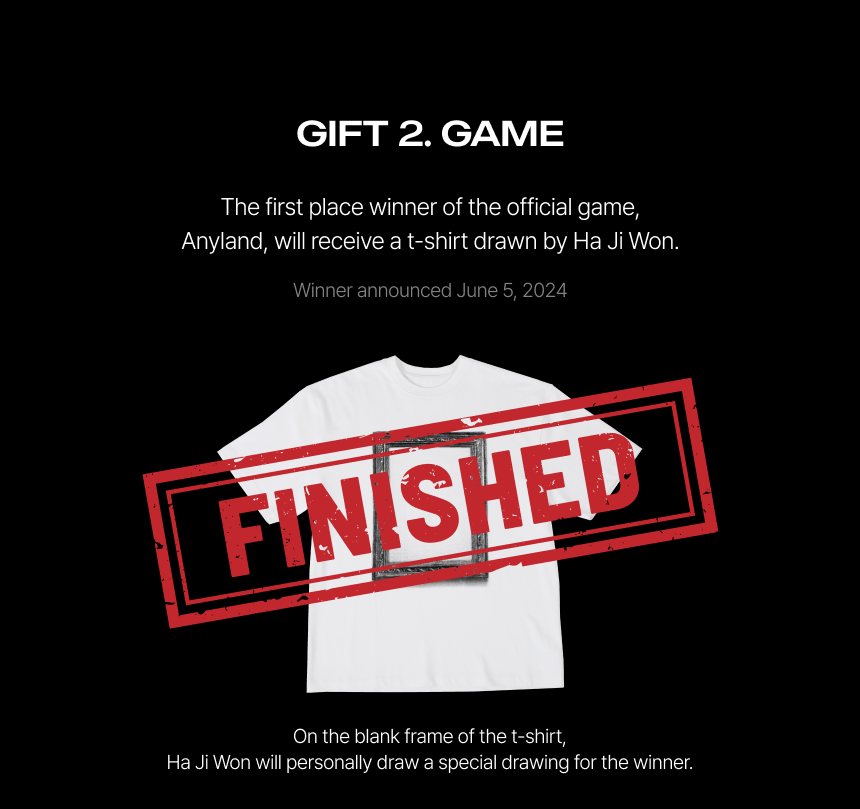 EVENT. 전시 기간동안 다양한 이벤트 추첨을 통하여 작가 하지원의 개인전에 전시된 메쉬 프린팅 탑과 드로잉 트셔츠를 받을 수 있는 기회를 드립니다. 기간 : 24.05.10 ~ 24.06.08