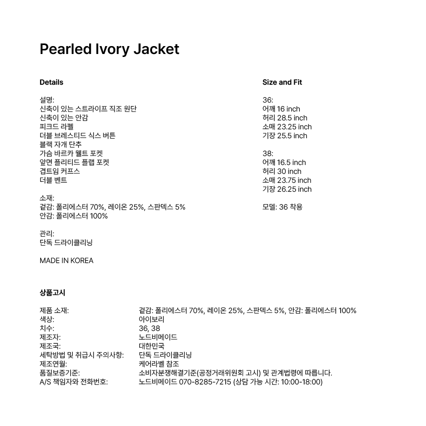 NODEBEMADEPearled Ivory Jacket00개 리뷰₩730,000배송정보상품코드0232908946배송방식택배배송비무료배송평균 배송일?3일국제배송불가능제주/도서산간제주 ₩4,000/도서산간 ₩4,000WALA WAVE x 이윤정 작가 한정판 아트 콜라보"한승수" 모델 PICK 패션 추천 가이드총 상품 금액₩0장바구니
