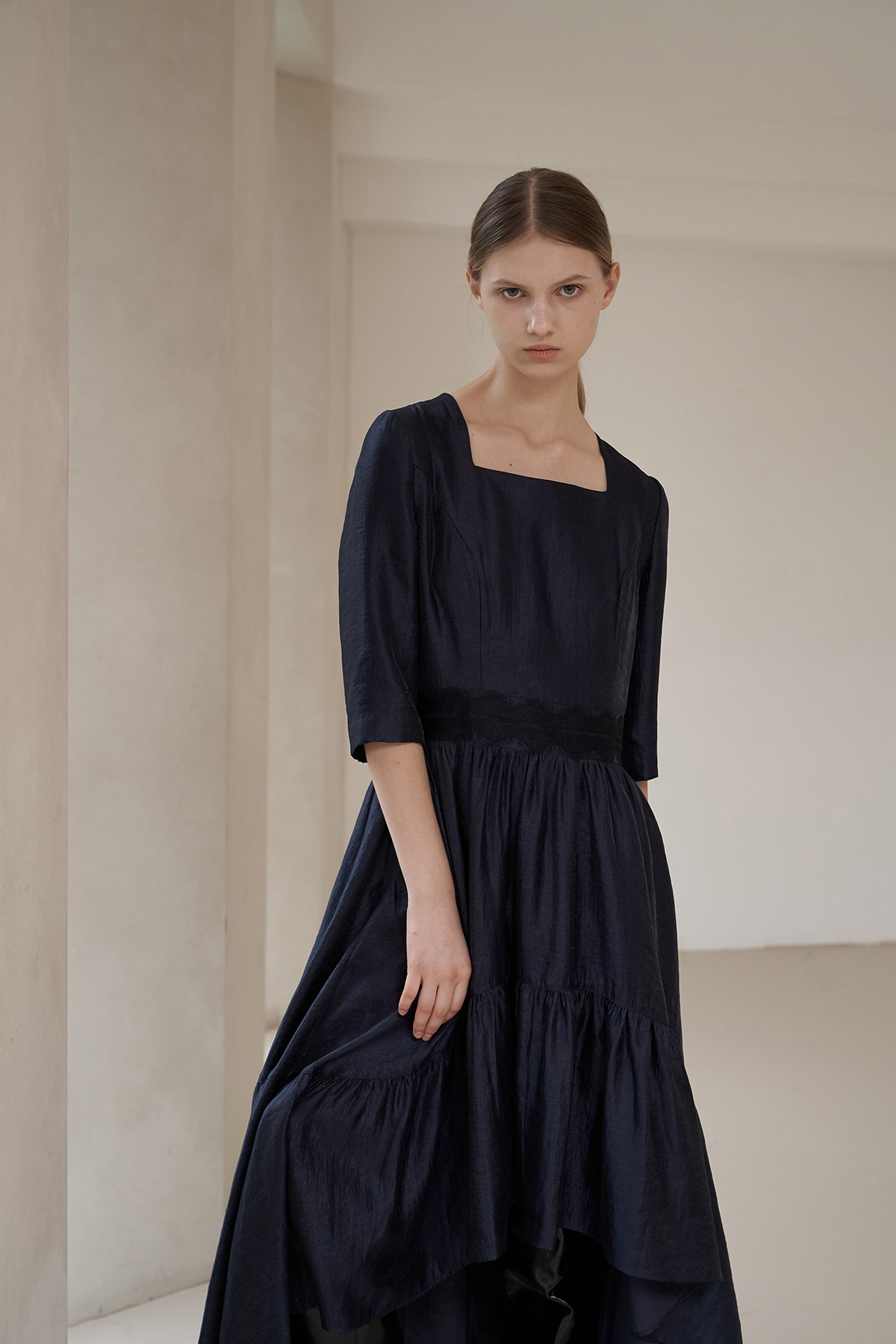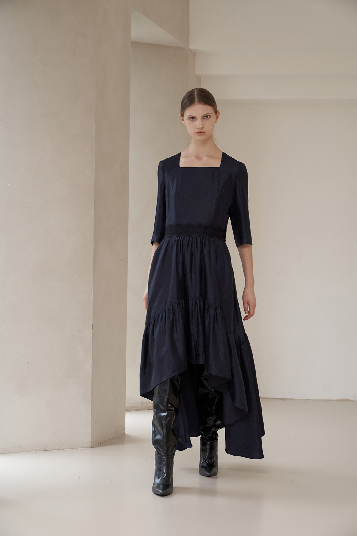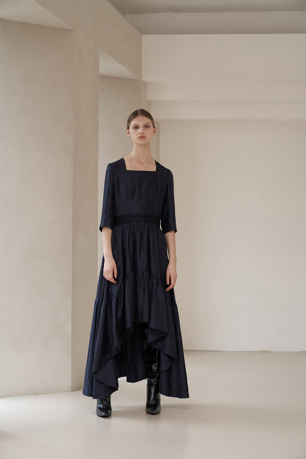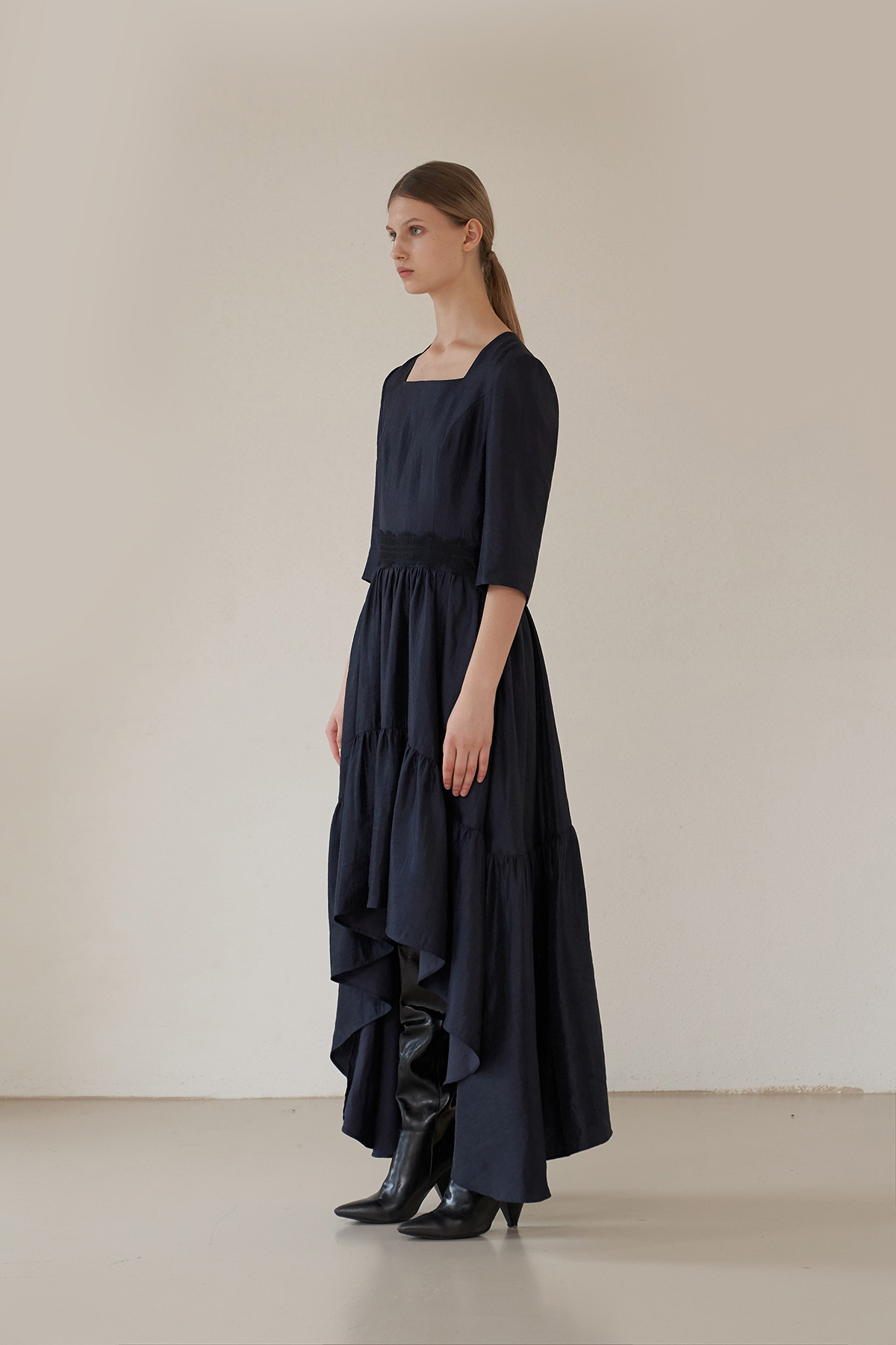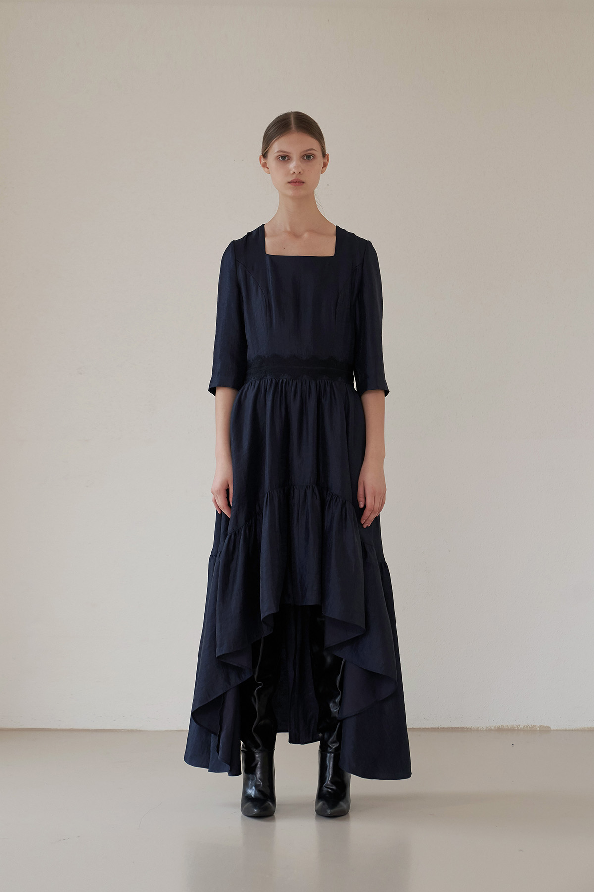 [까이지엔느] 스퀘어넥 7부 소매 언밸런스 롱 원피스