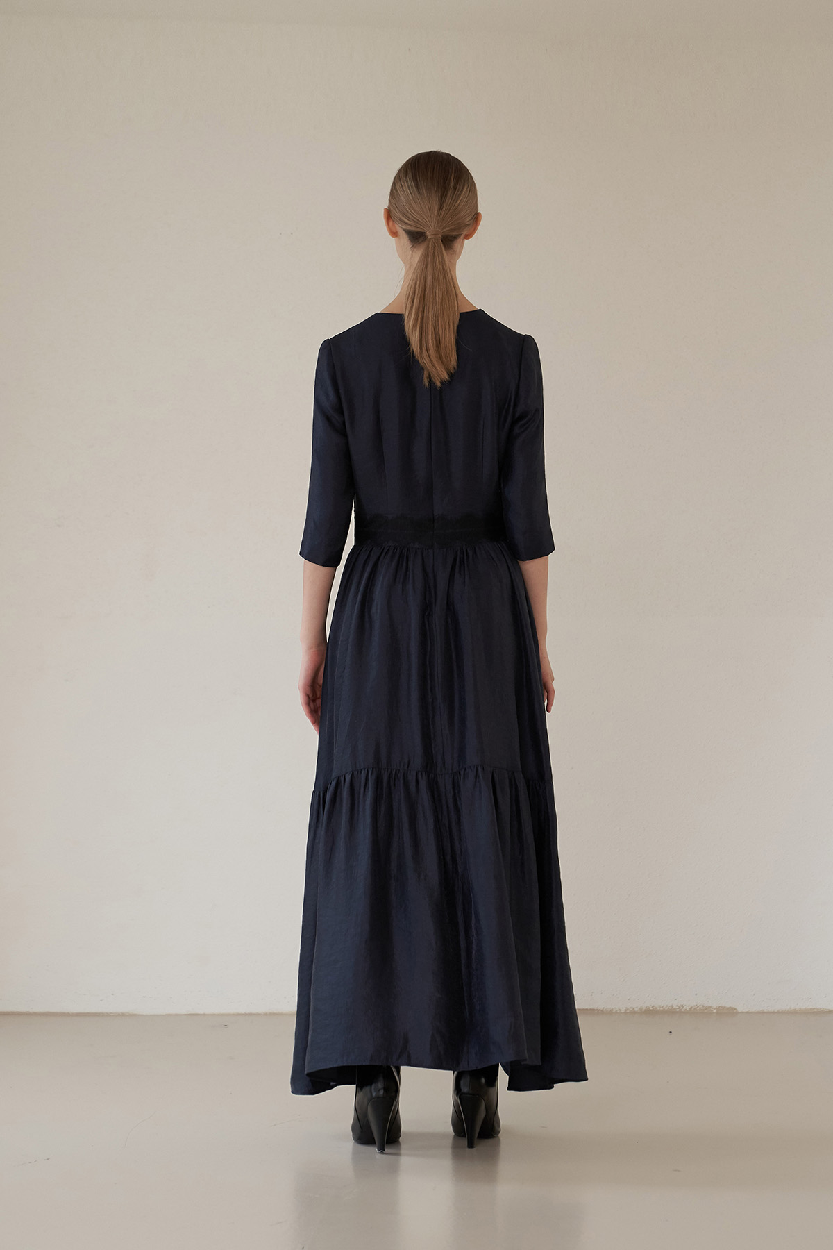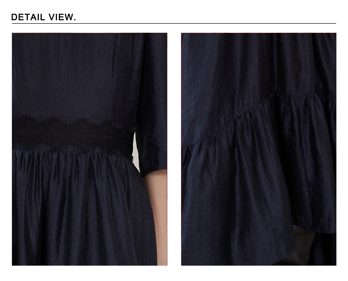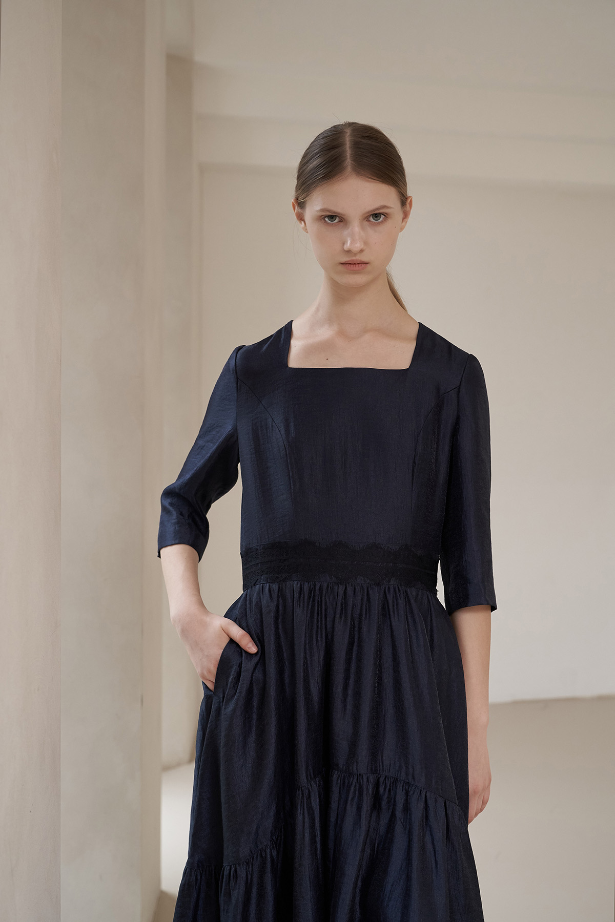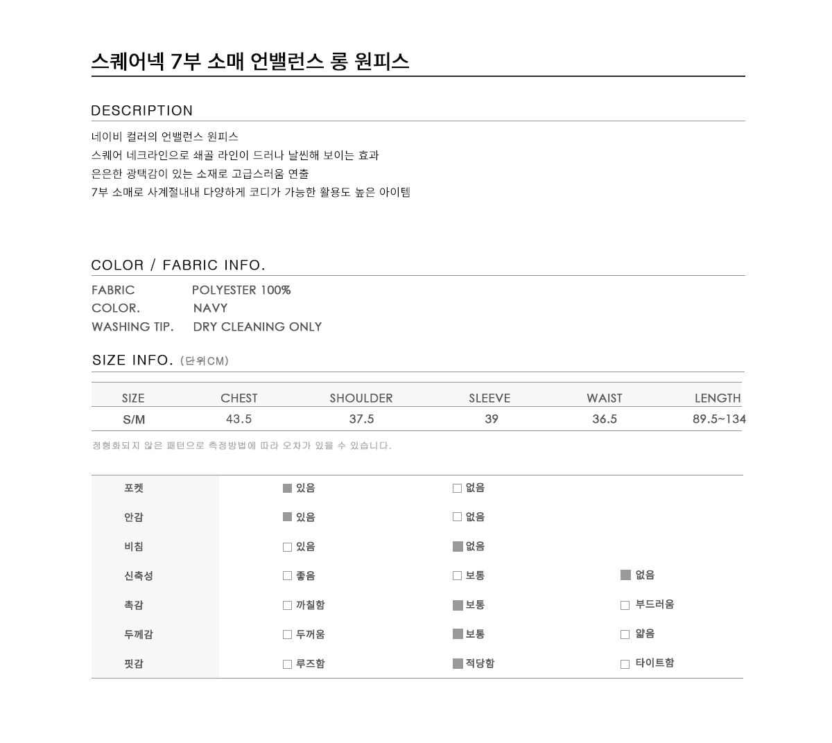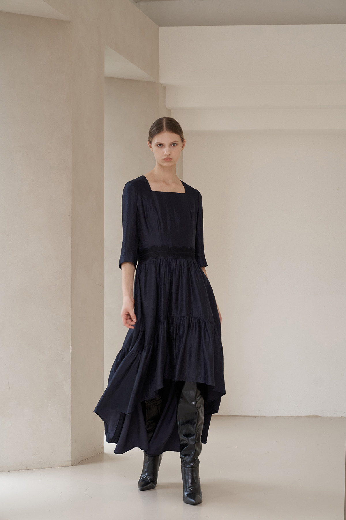 [까이지엔느] 스퀘어넥 7부 소매 언밸런스 롱 원피스