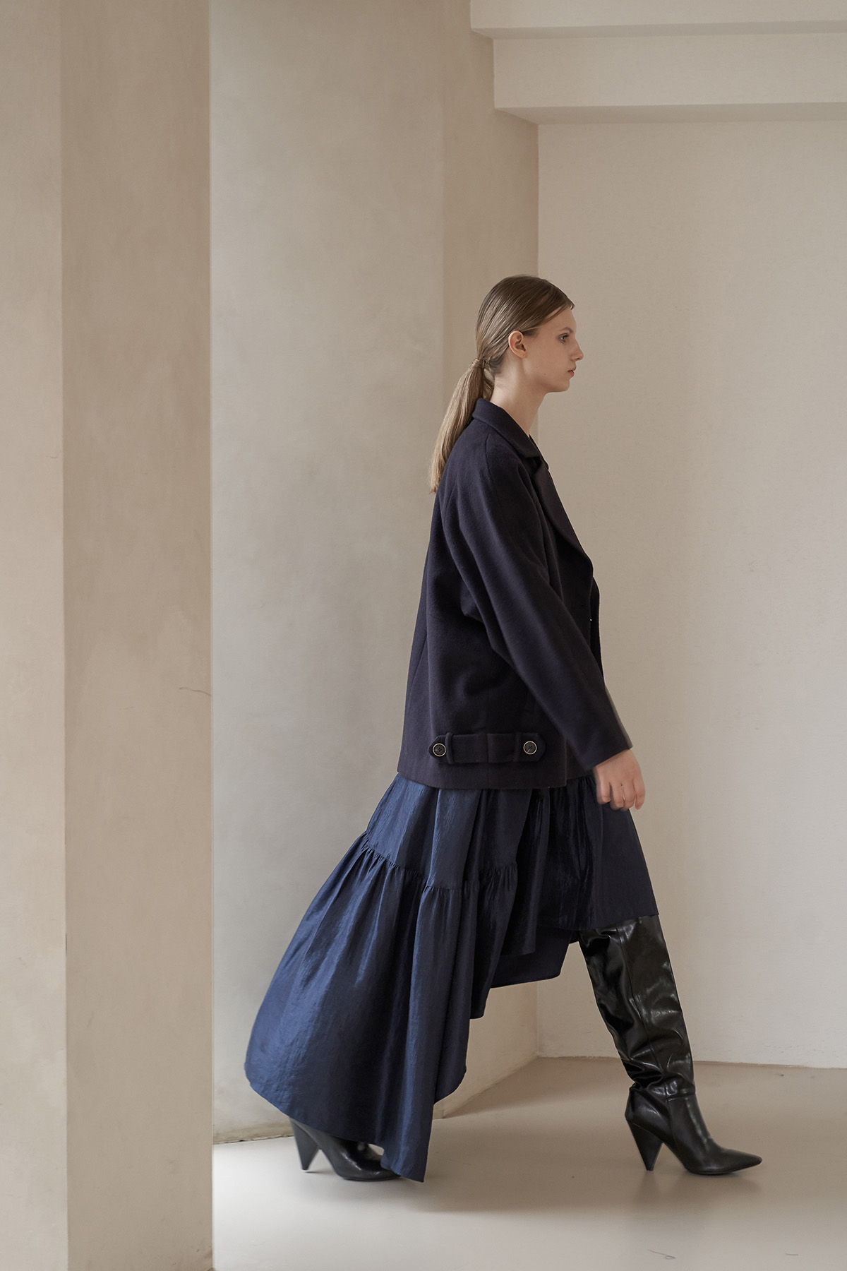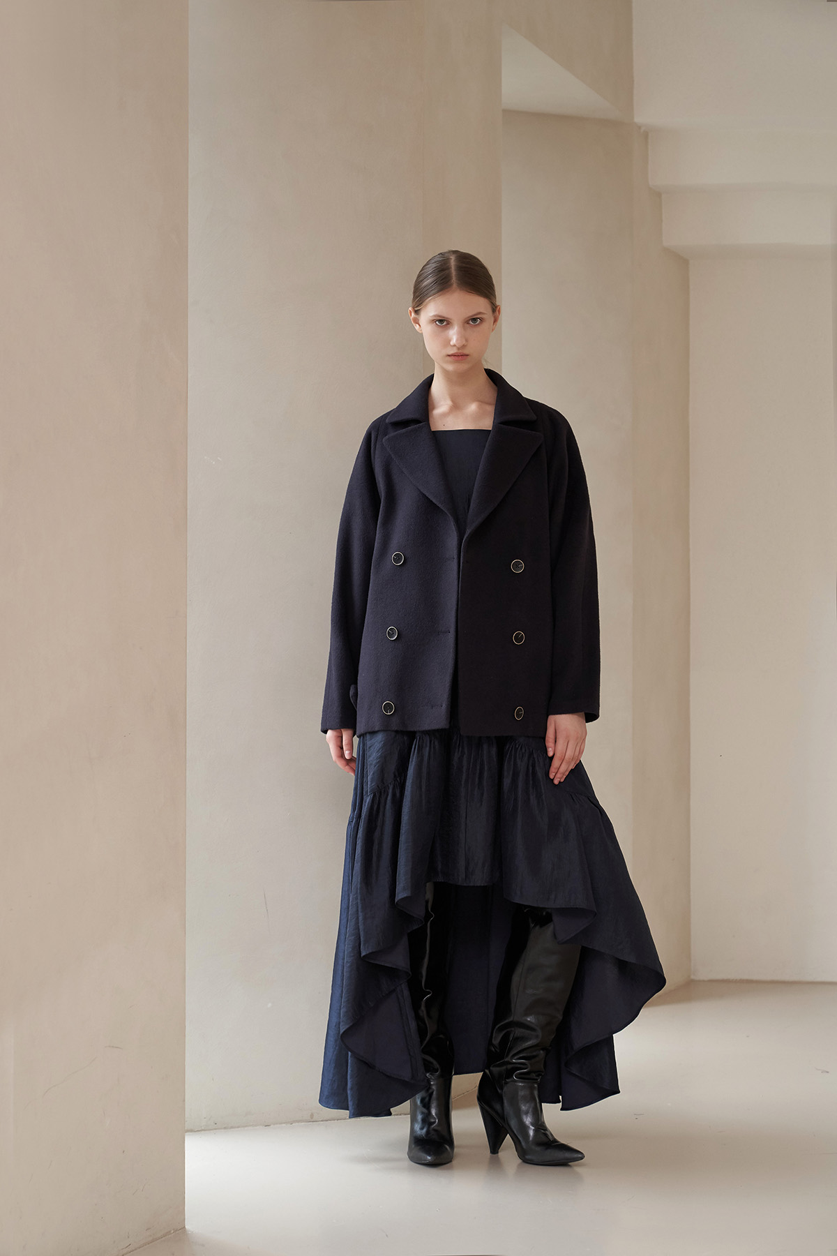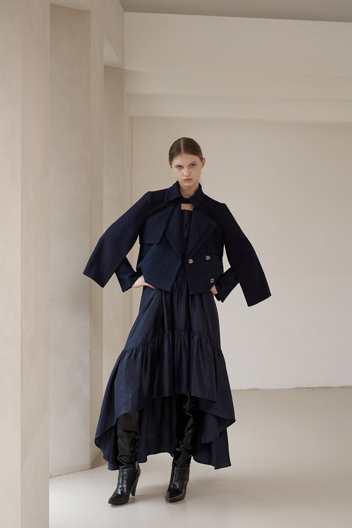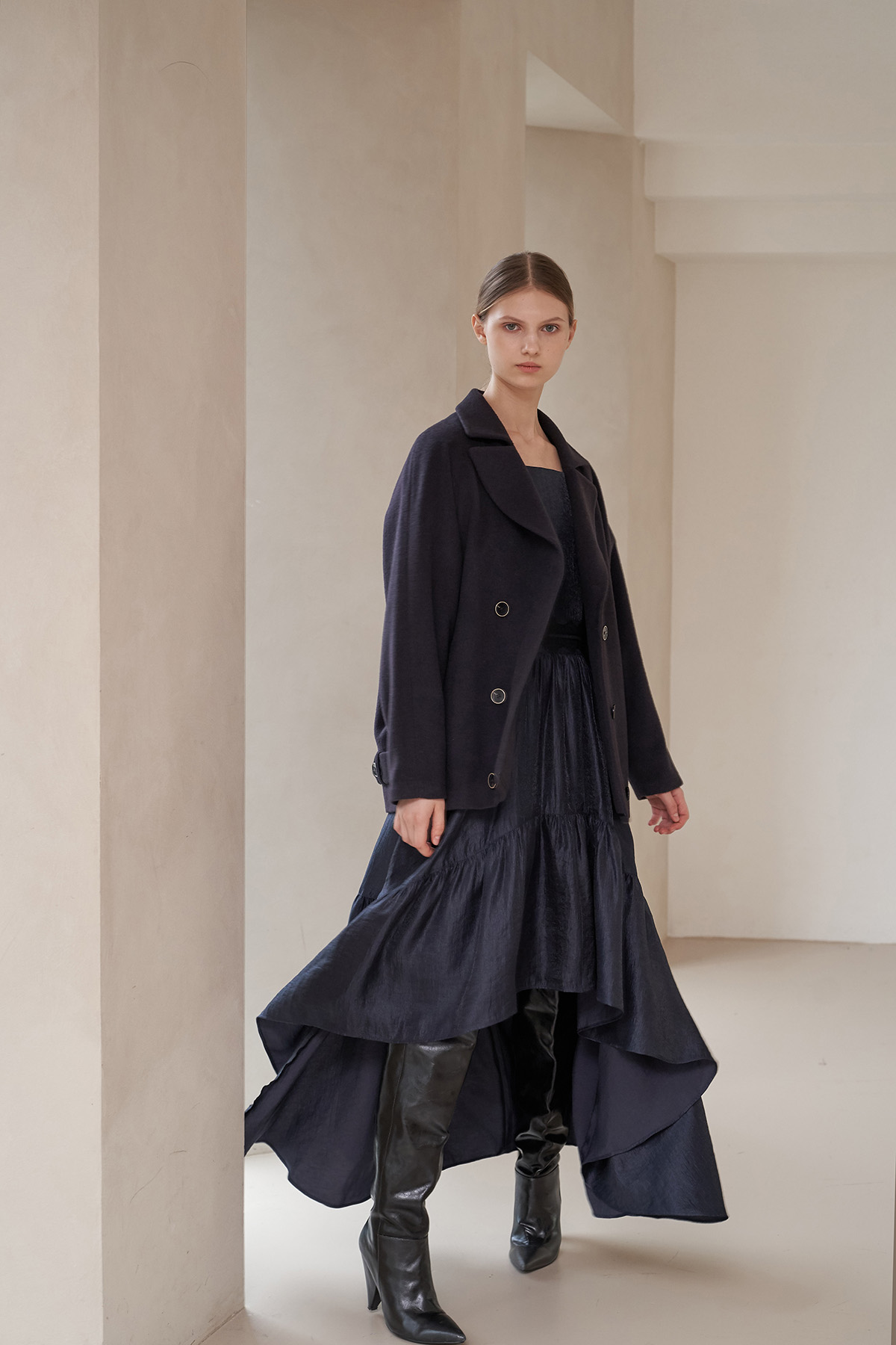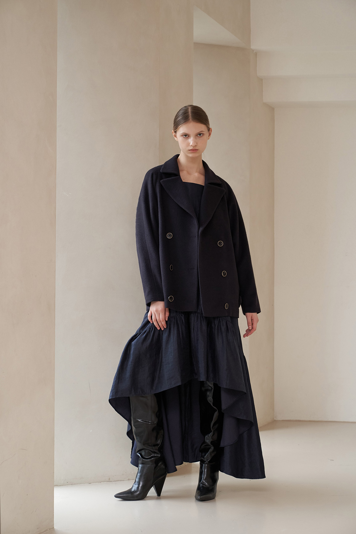 [까이지엔느] 스퀘어넥 7부 소매 언밸런스 롱 원피스