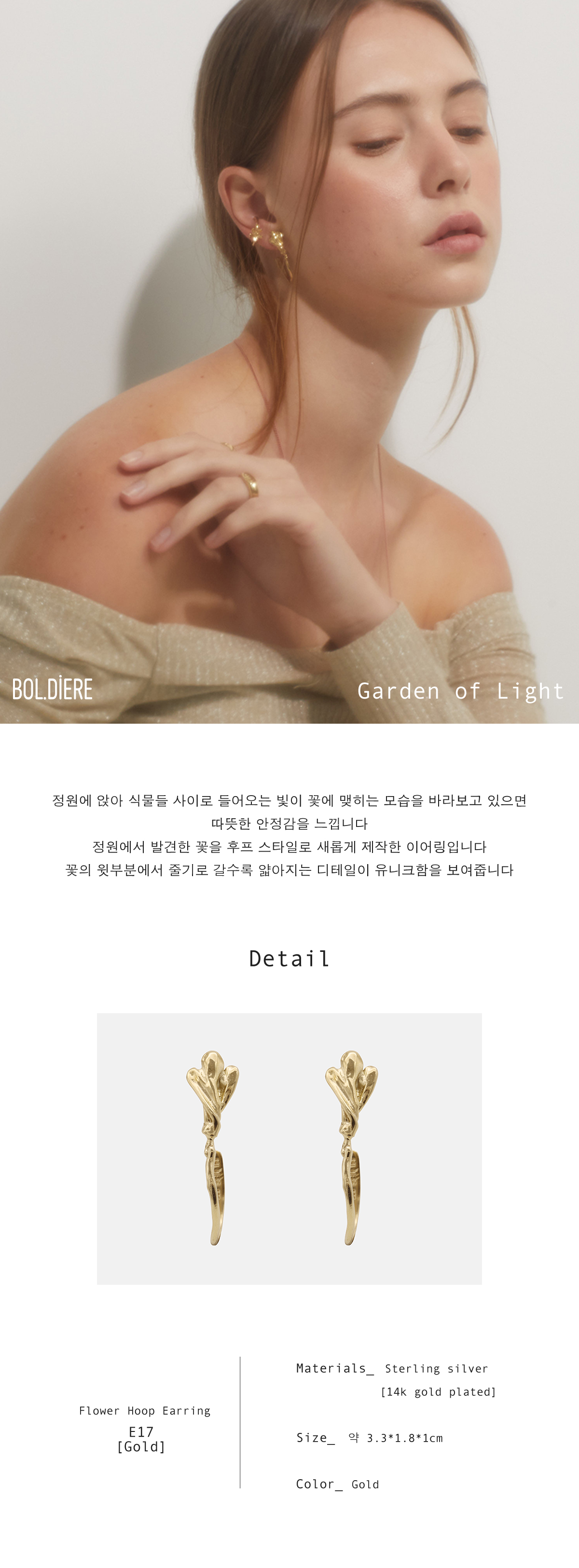 BOLDIEREFlower Hoop Earring_E17[Gold]00개 리뷰₩86,000배송정보상품코드2135818749배송방식택배배송비무료배송평균 배송일?7일국제배송불가능제주/도서산간제주 무료/도서산간 무료WALA WAVE x 이윤정 작가 한정판 아트 콜라보"한승수" 모델 PICK 패션 추천 가이드총 상품 금액₩0장바구니