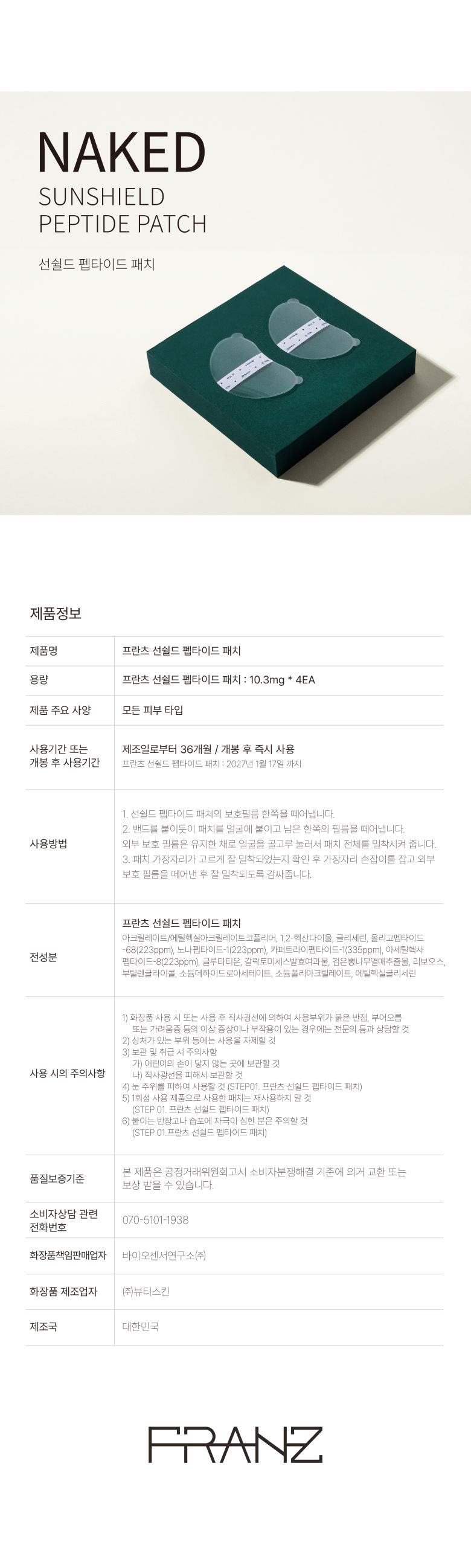 FRANZ프란츠 선쉴드 펩타이드 패치 4회분00개 리뷰₩12,000배송정보상품코드0022098161배송방식택배배송비30,000원 이상 구매시 무료 배송평균 배송일?3일국제배송불가능제주/도서산간제주 ₩3,500/도서산간 ₩3,500WALA WAVE x 이윤정 작가 한정판 아트 콜라보"한승수" 모델 PICK 패션 추천 가이드총 상품 금액₩0장바구니