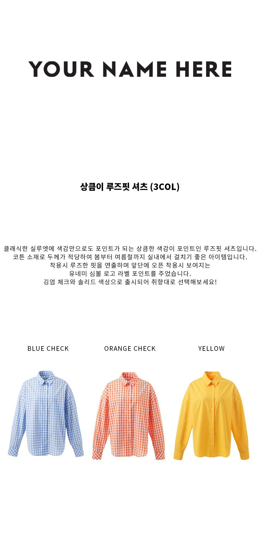 YOUR NAME HERE상큼이 루즈핏 셔츠 (3COL) Y4T01400개 리뷰₩119,000배송정보상품코드5737932747배송방식택배배송비무료배송평균 배송일?5일국제배송불가능제주/도서산간제주 ₩8,000/도서산간 ₩5,000WALA WAVE x 이윤정 작가 한정판 아트 콜라보"한승수" 모델 PICK 패션 추천 가이드총 상품 금액₩0장바구니