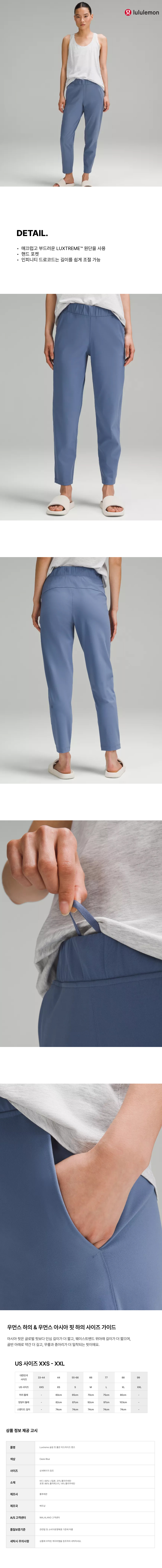 LULULEMONLuxtreme 슬림 핏 풀온 미드라이즈 팬츠-Oasis Blue00개 리뷰20%₩169,000₩135,000배송정보상품코드8466857539배송방식택배배송비무료배송평균 배송일?5일국제배송불가능제주/도서산간제주 ₩8,000/도서산간 ₩5,000WALA WAVE x 이윤정 작가 한정판 아트 콜라보"한승수" 모델 PICK 패션 추천 가이드총 상품 금액₩0장바구니